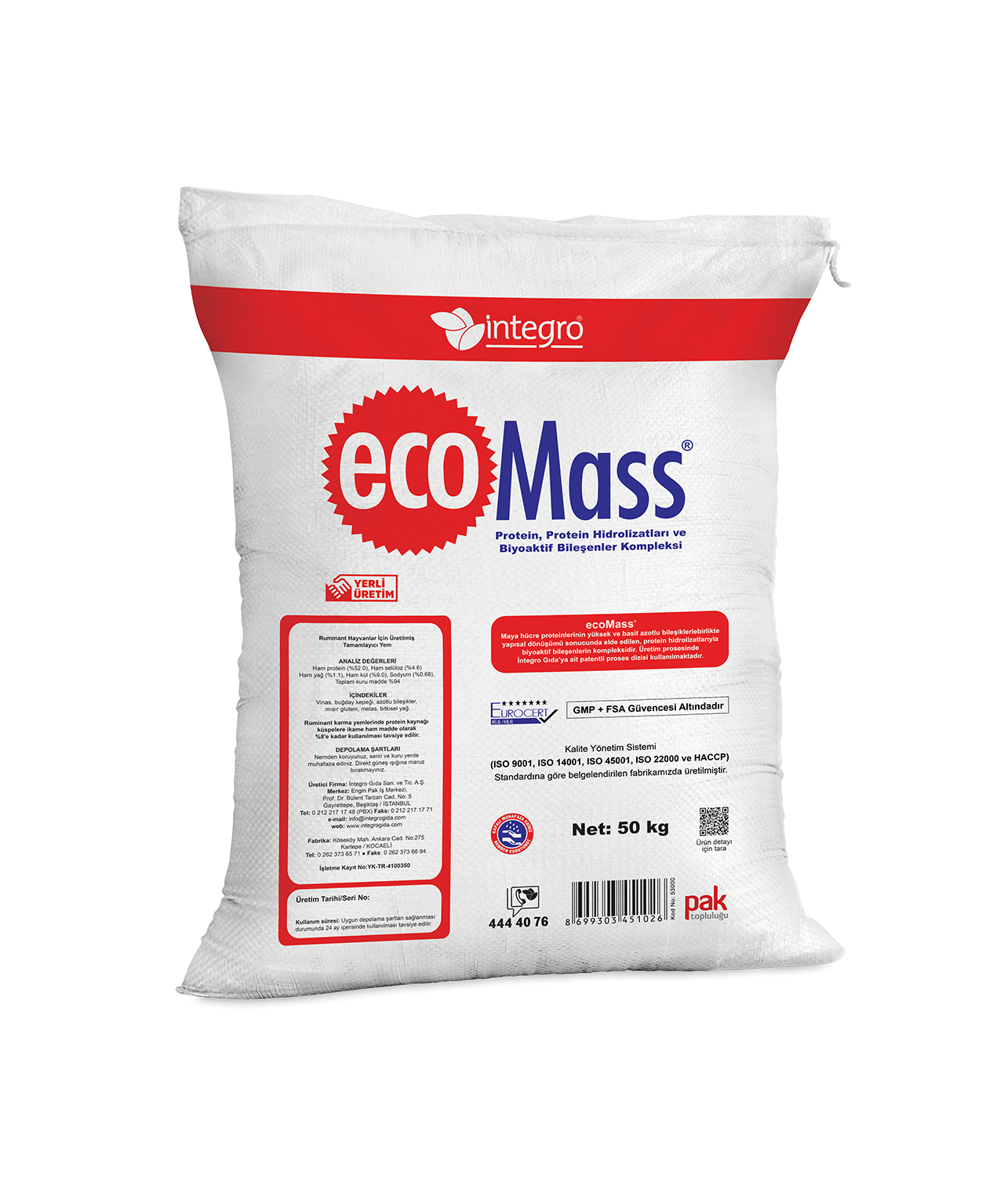 Ruminant hayvanlar için İntegro'ya ait patentli proses dizisi kullanılarak üretilmiş Türkiye'nin ilk ve tek %52-%55 ham protein alternatifi ile muhteşem bir protein kaynağı olan EcoMass ile tanışın!